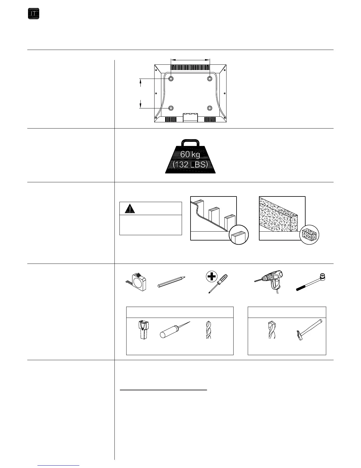 ● Il muro deve essere capace di portare almeno cinque volte il peso totale del televisore e del
