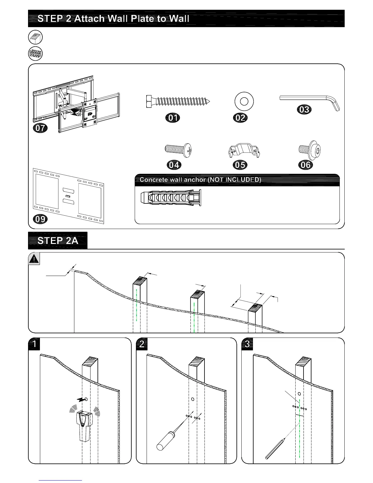 Mounting Dream MD2298 - Step 2: Attach Wall Plate to Wall; Parts and Hardware for Wall Mounting; Wood Stud Wall Installation (2 A)