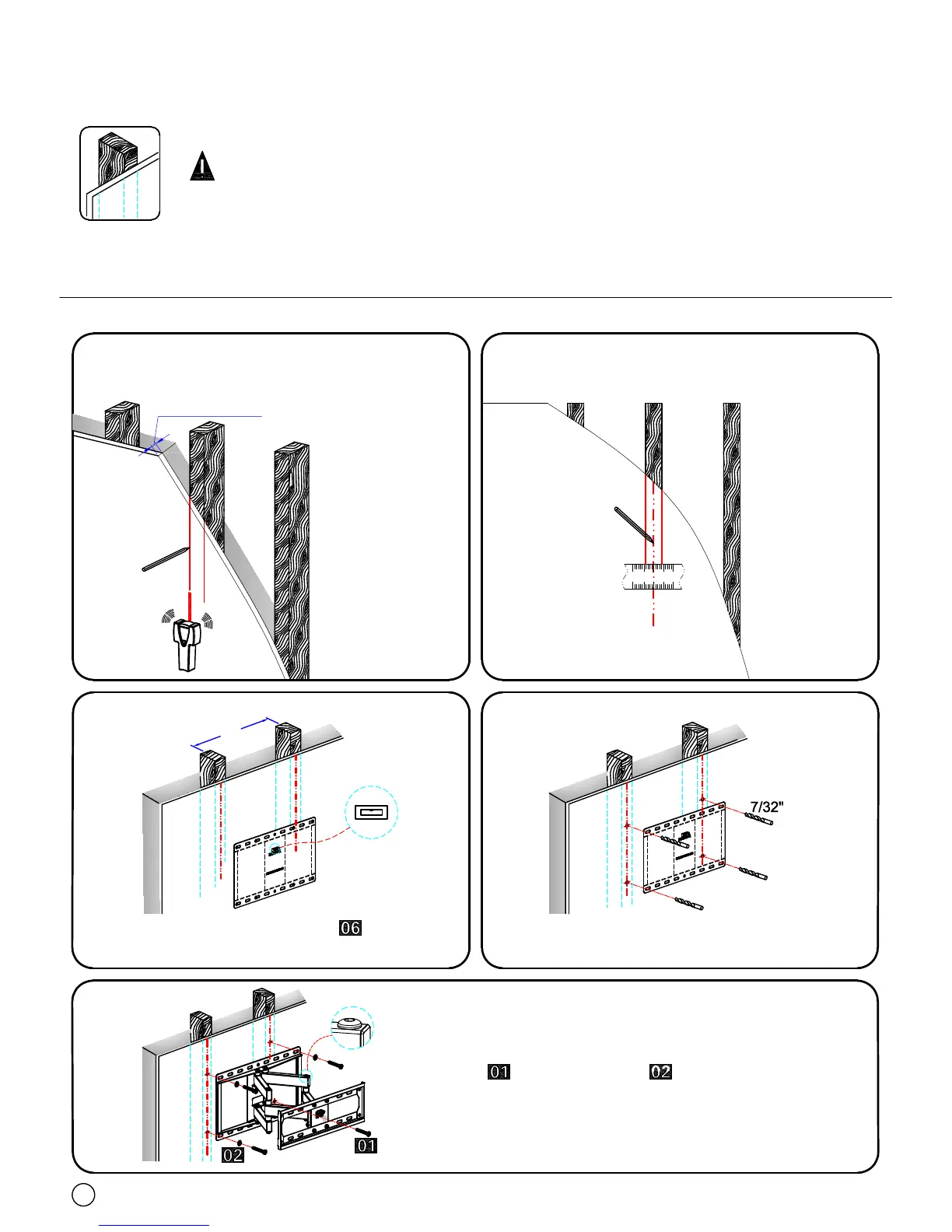 1. Wall mount must be installed into wood stud's center, not drywall alone.