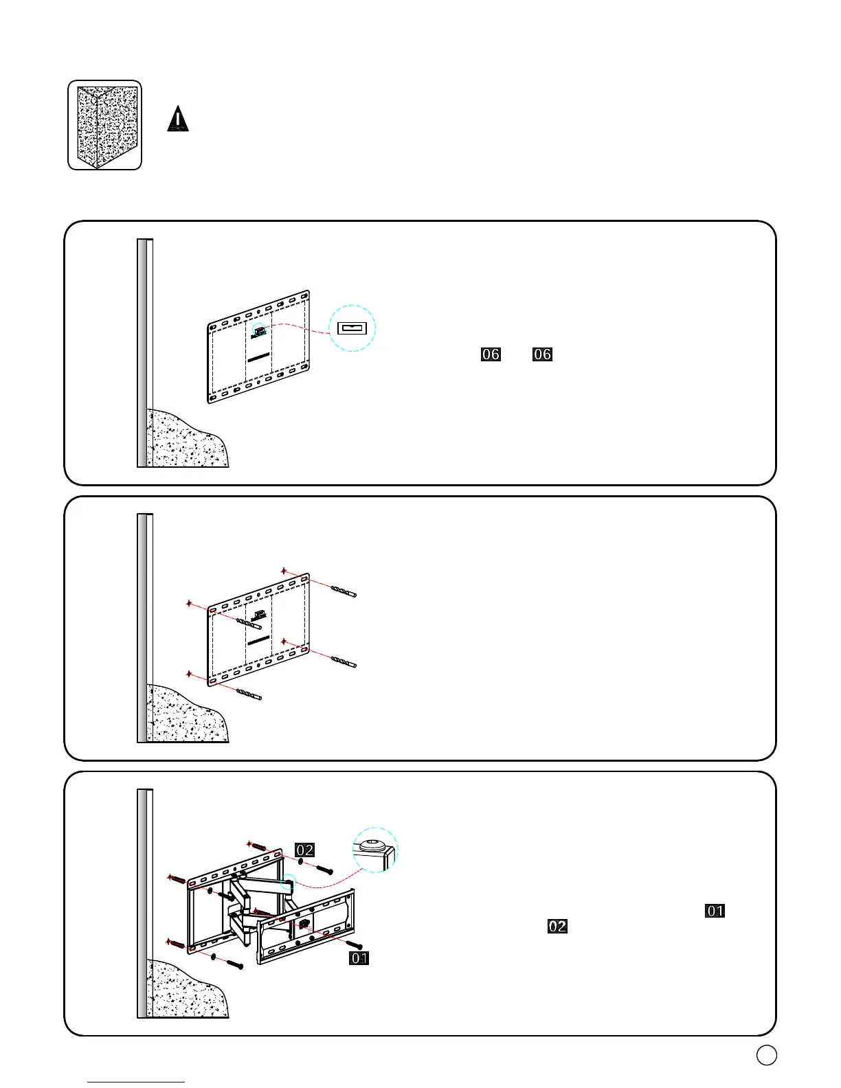 3. All anchors/lag bolts MUST BE firmly tightened to prevent unwanted movement of the wall plate.