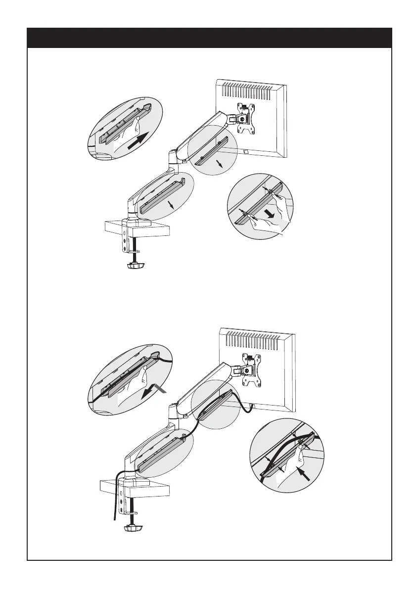 Run cables from monitor through bottom of gas spring arm. Reattach plastic covers as shown in diagram.