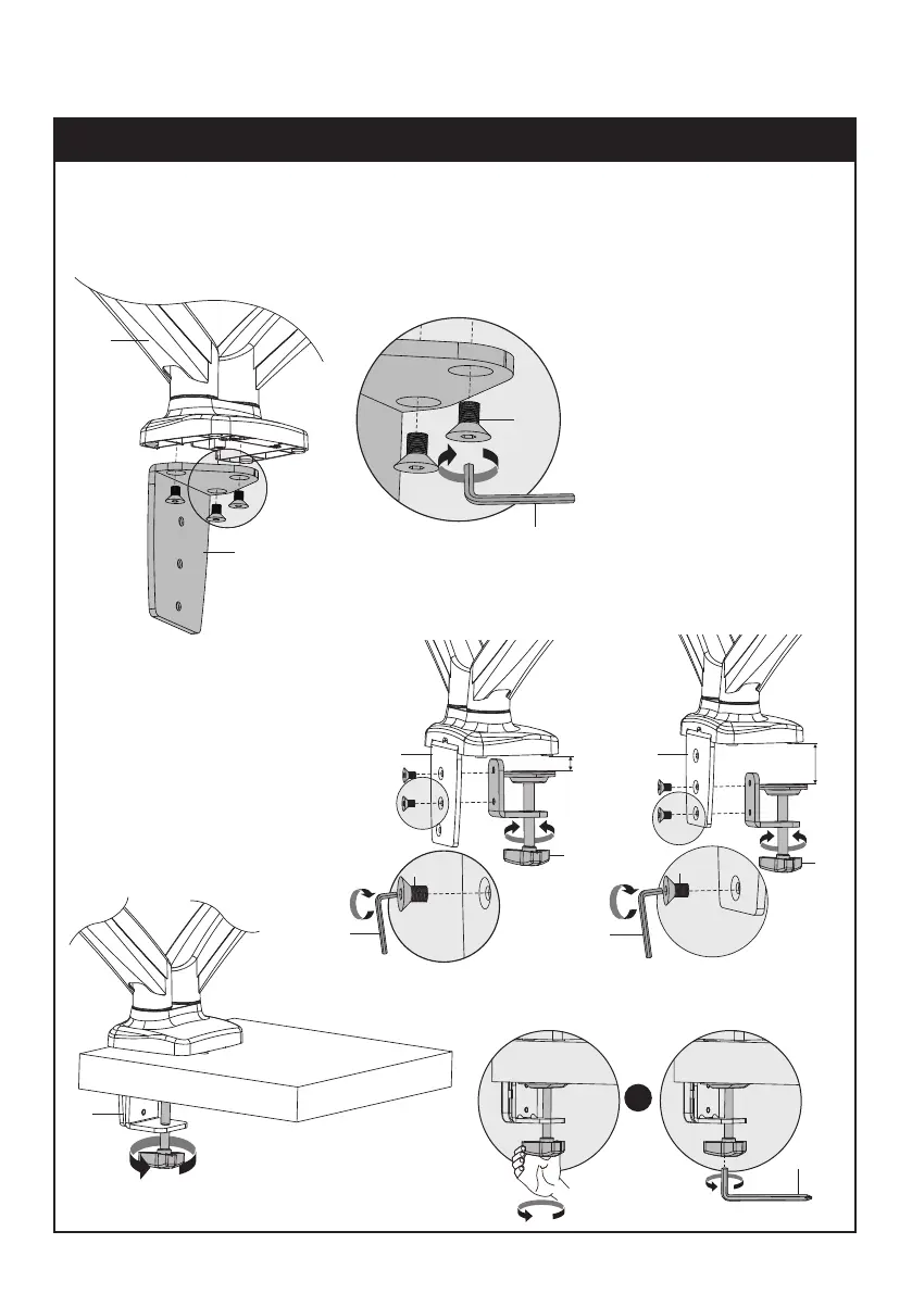 Attach clamp (D) to bracket (C) using bolts (E) and 4mm allen key (K). Mount according to thickness of desktop.