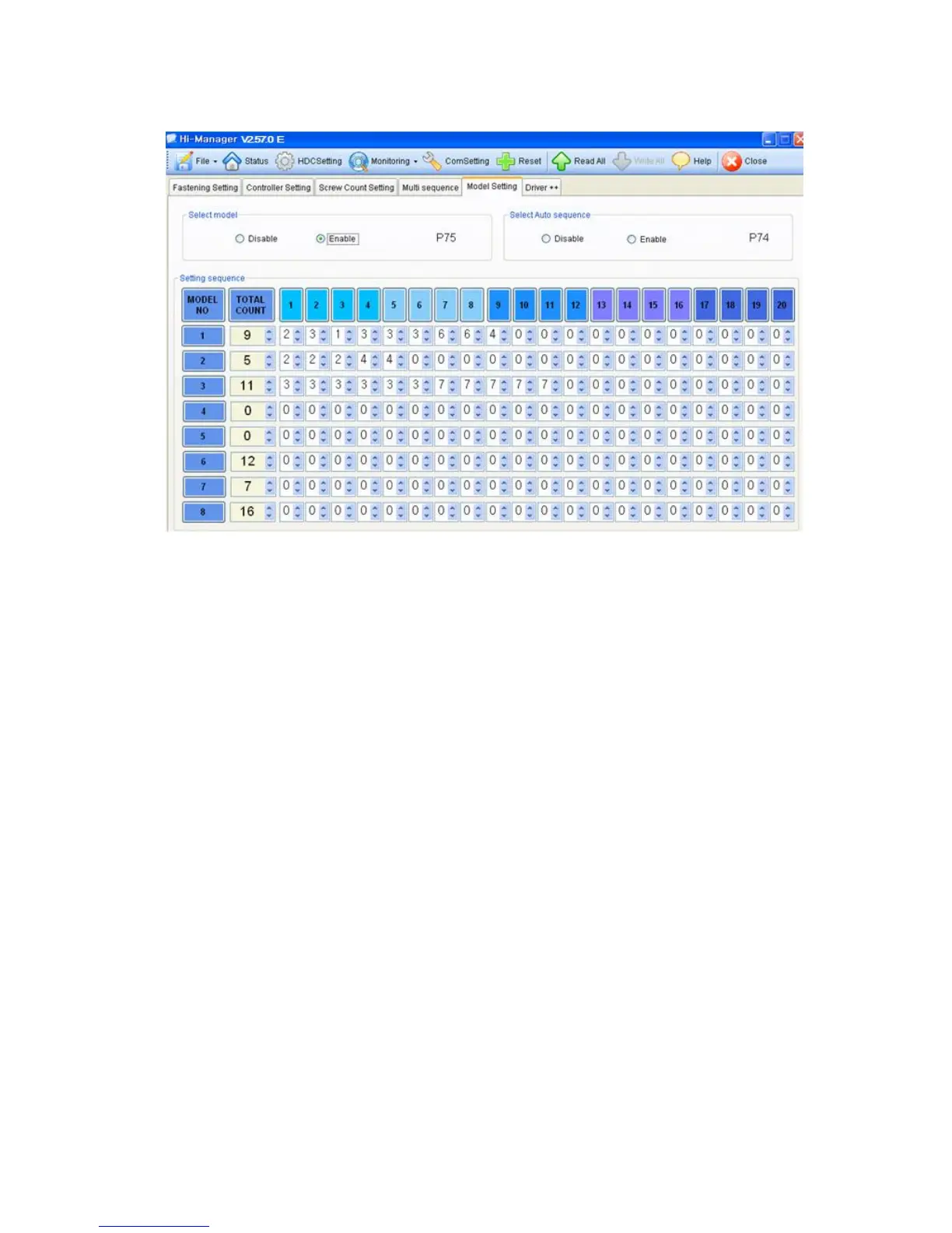 For sequence fastening, select Enable on P74 and P75.