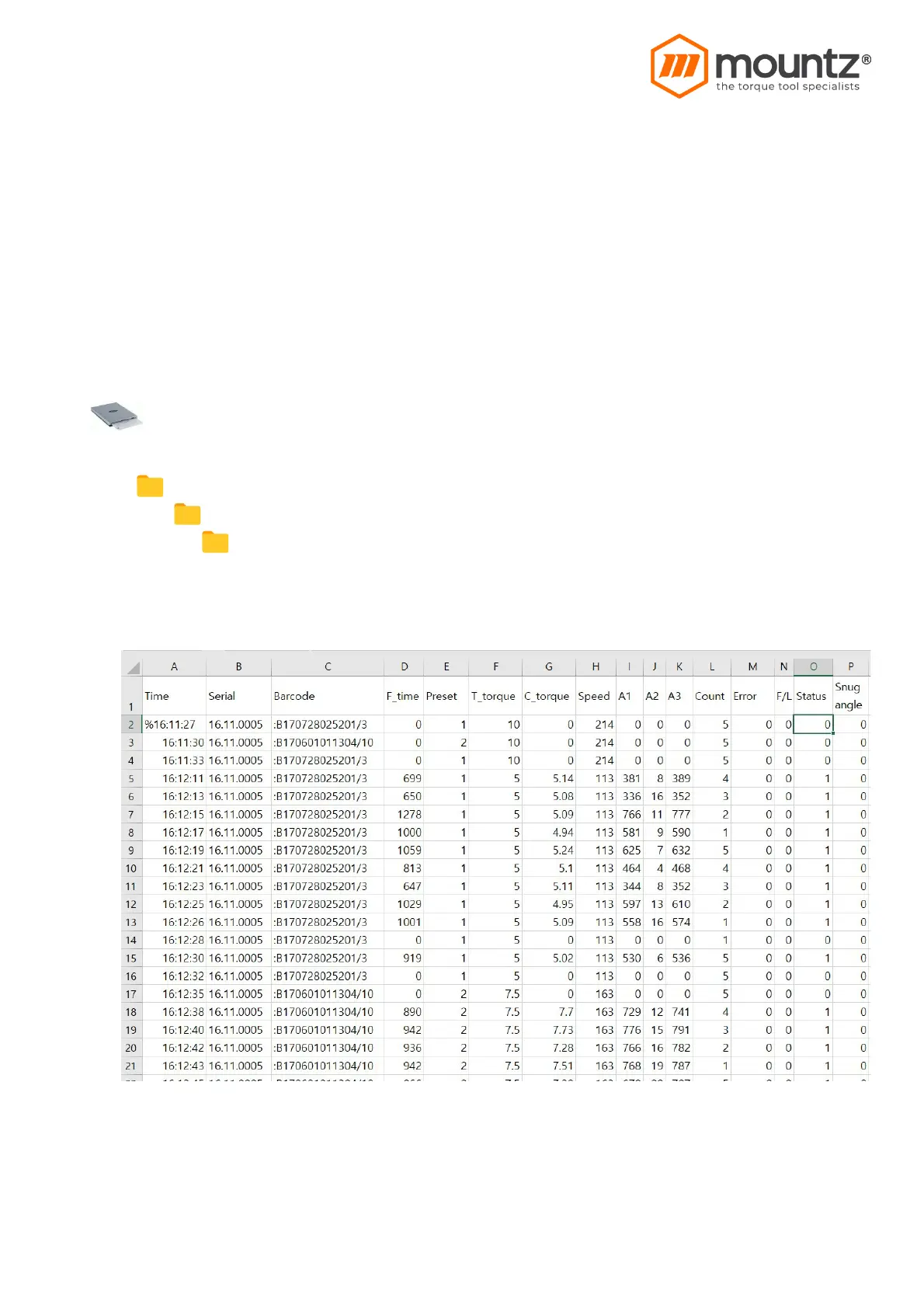 Clock time, Fastening time, Preset#, Target torque, Converted torque, Speed, A1, A2, A3 angles, Count no.