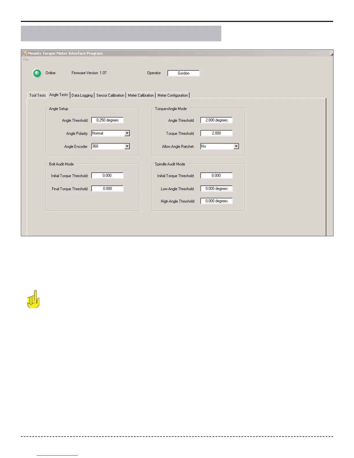 All angle tests must be entered using the PC Windows based Calibration Program. Once this is done the tests can be
