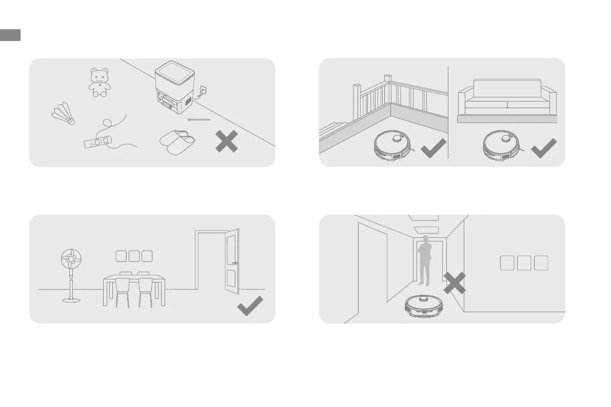· Folgen Sie dem Roboter bei der ersten Inbetriebnahme während des Reinigungsvorgangs, um mögliche Hindernisse rechtzeitig zu entfernen.