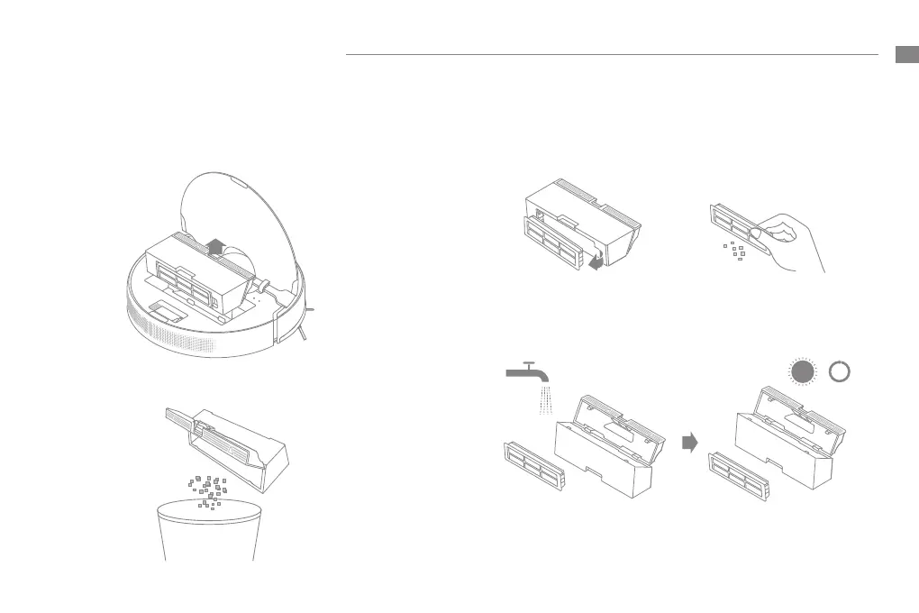 4. Lave el contenedor de polvo y el ltro con agua y luego
