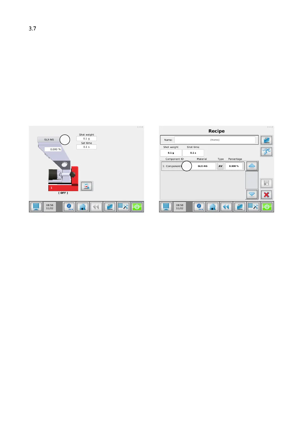 (1), or by pressing the material name in the recipe menu (2).