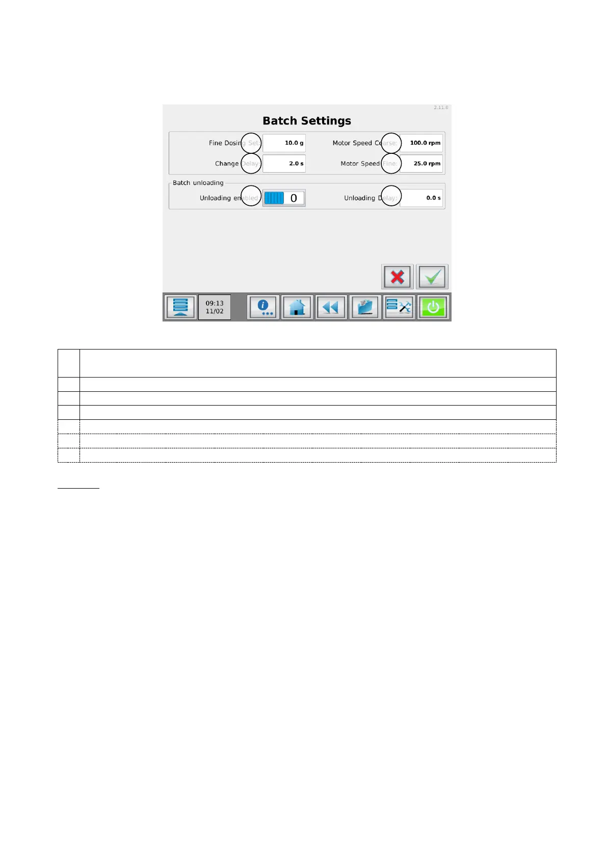 For each batch dosing, the settings in the screen below can be made, except for the Batch unloading settings