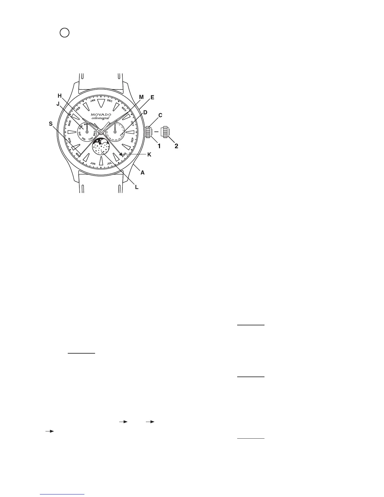 Movado SE - Quartz 3-Hand Moon Phase;Day;Date Models - Type A; Legend and Important Notes (Moon Phase;Day;Date Type A); Setting Instructions (Moon Phase;Day;Date Type A); Quick Change Correction for Date (Type A)