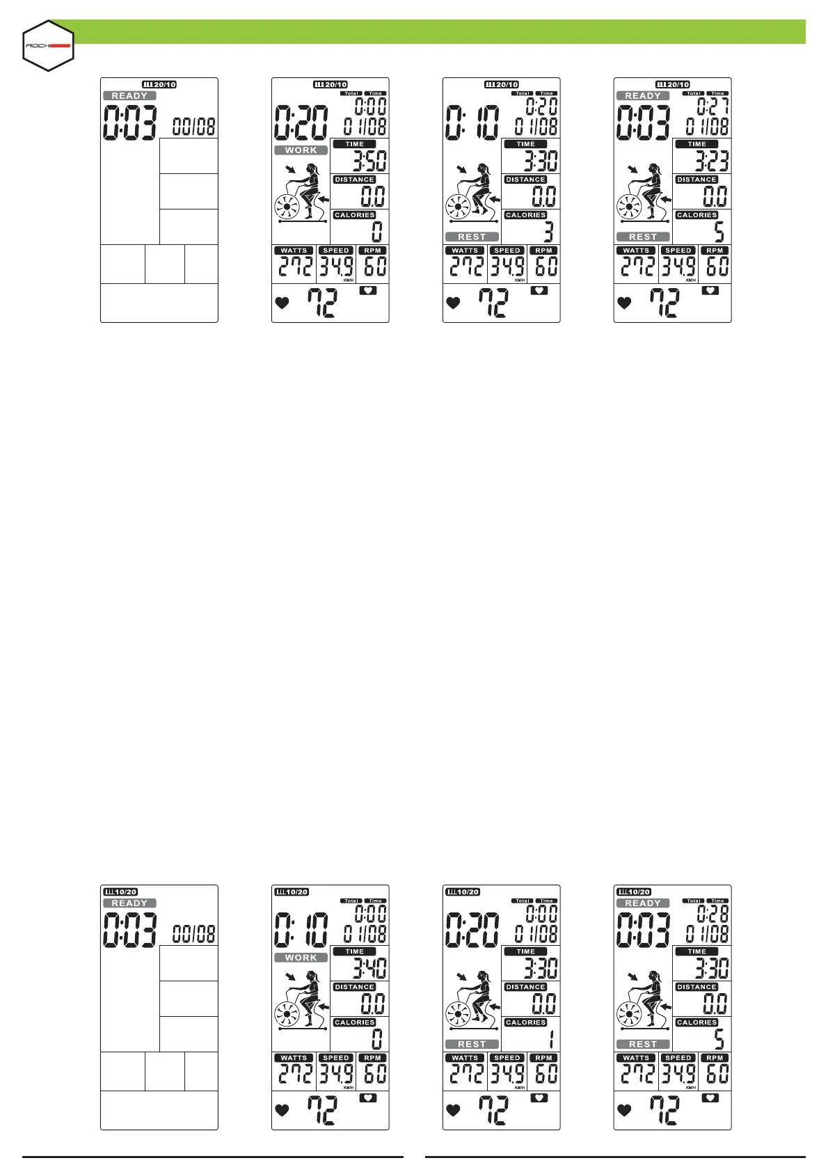 DISTANCE (DISPLAY 4), CALORIES (DISPLAY 5) for 30s and WATT (DISPLAY 6), SPEED (DISPLAY 2) and RPM