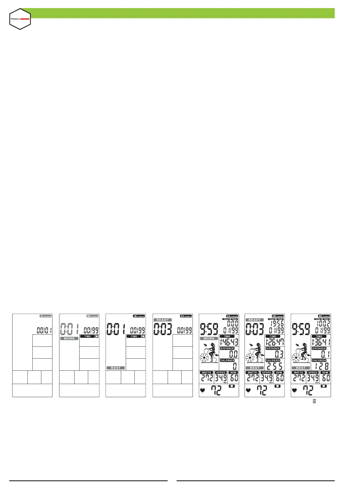 DISTANCE (DISPLAY 4), CALORIES (DISPLAY 5) for 30s and WATT (DISPLAY 6), SPEED (DISPLAY 2) and RPM