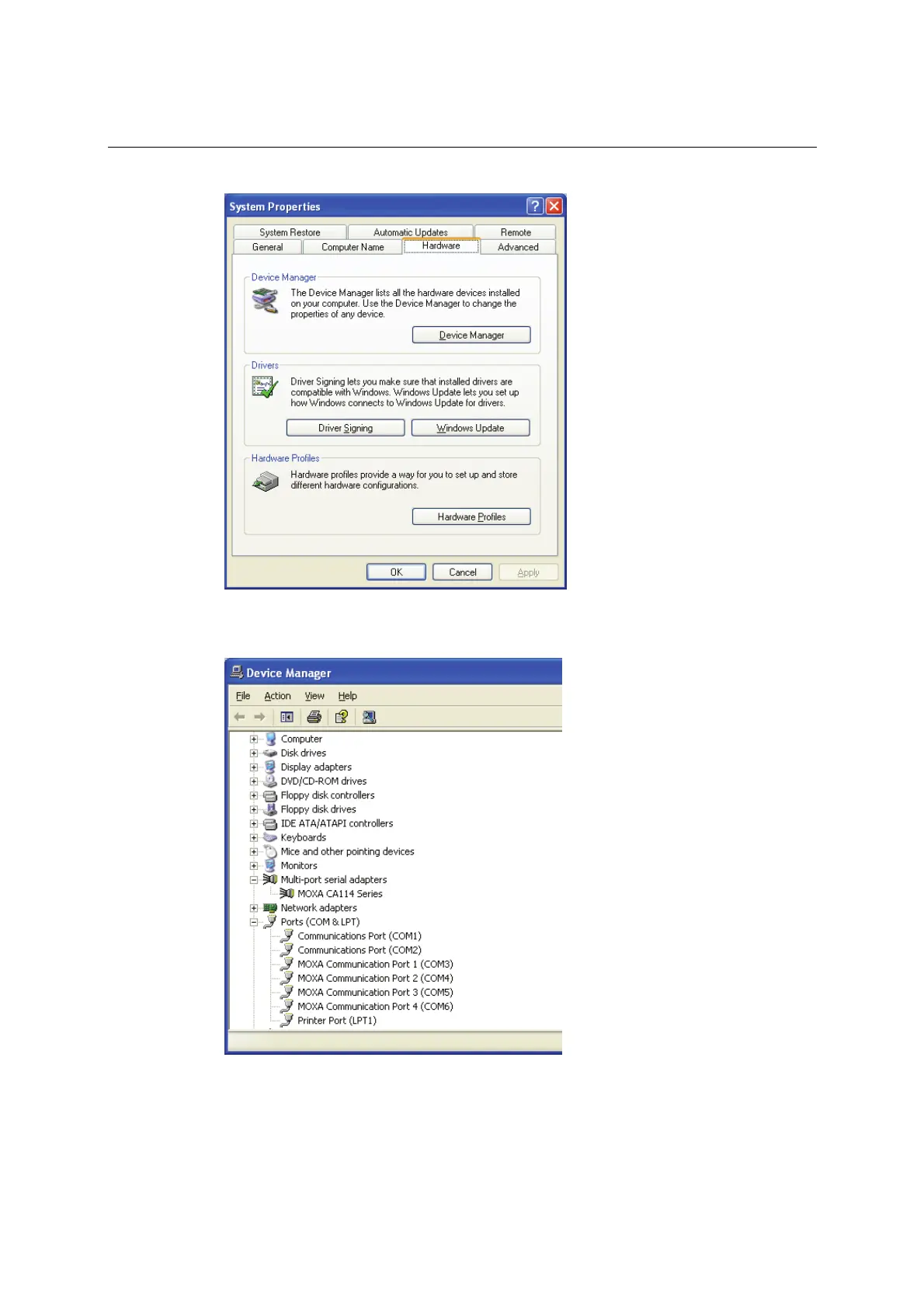 serial adapters. You should also see MOXA communication ports under Ports (COM &
