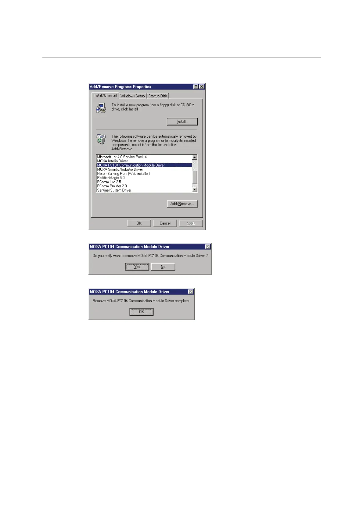 4. In the Install/Uninstall tab, select MOXA PC104 Communication Module Driver and click