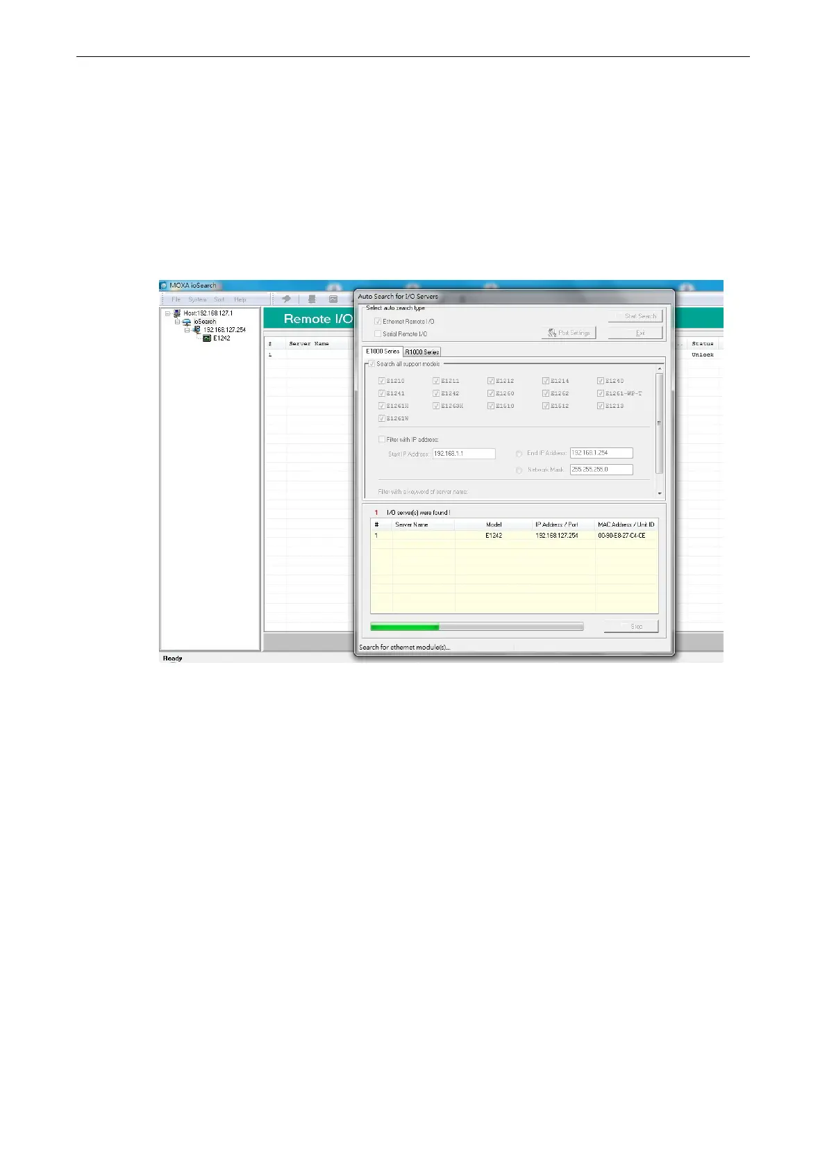 I/O Server. A dialog window will pop up. Click Start Search to begin searching for the ioLogik E1200.