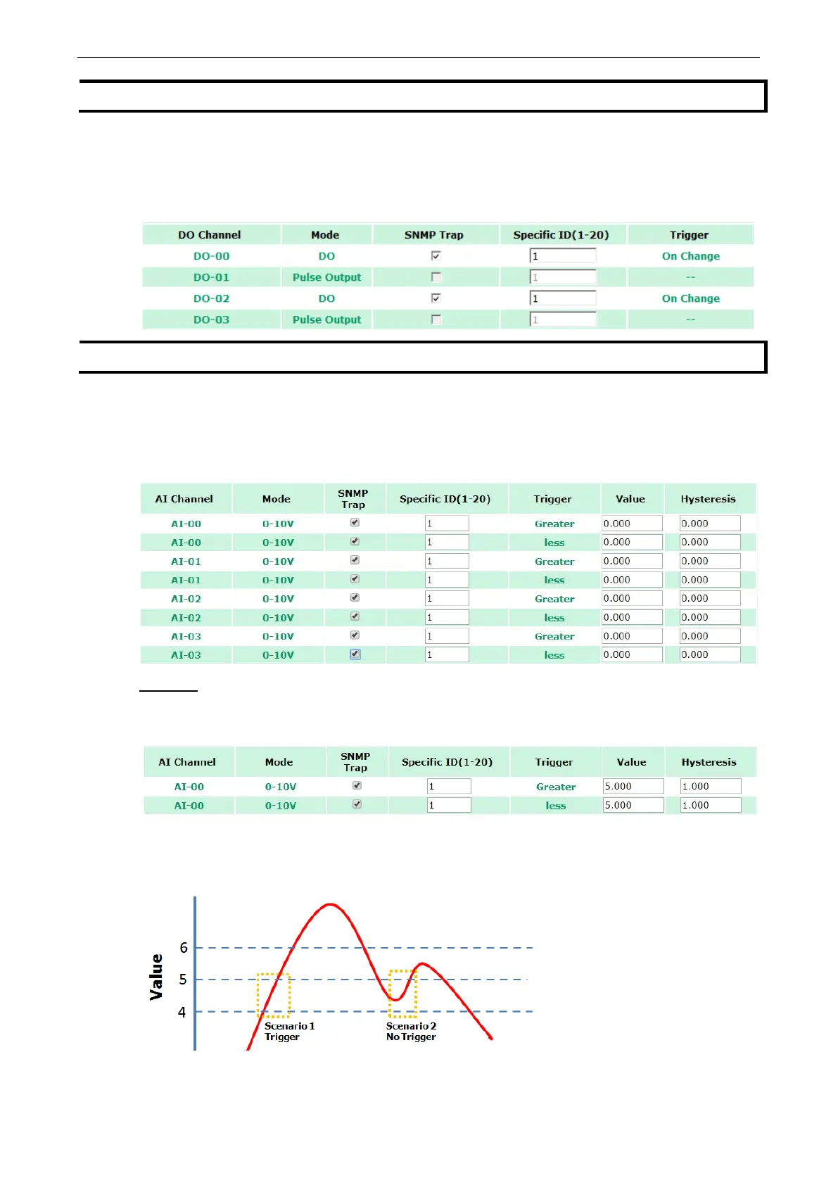 When Trigger = Greater, Value = 5, and Hysteresis = 1, the SNMP trap will only be triggered if the analog signal