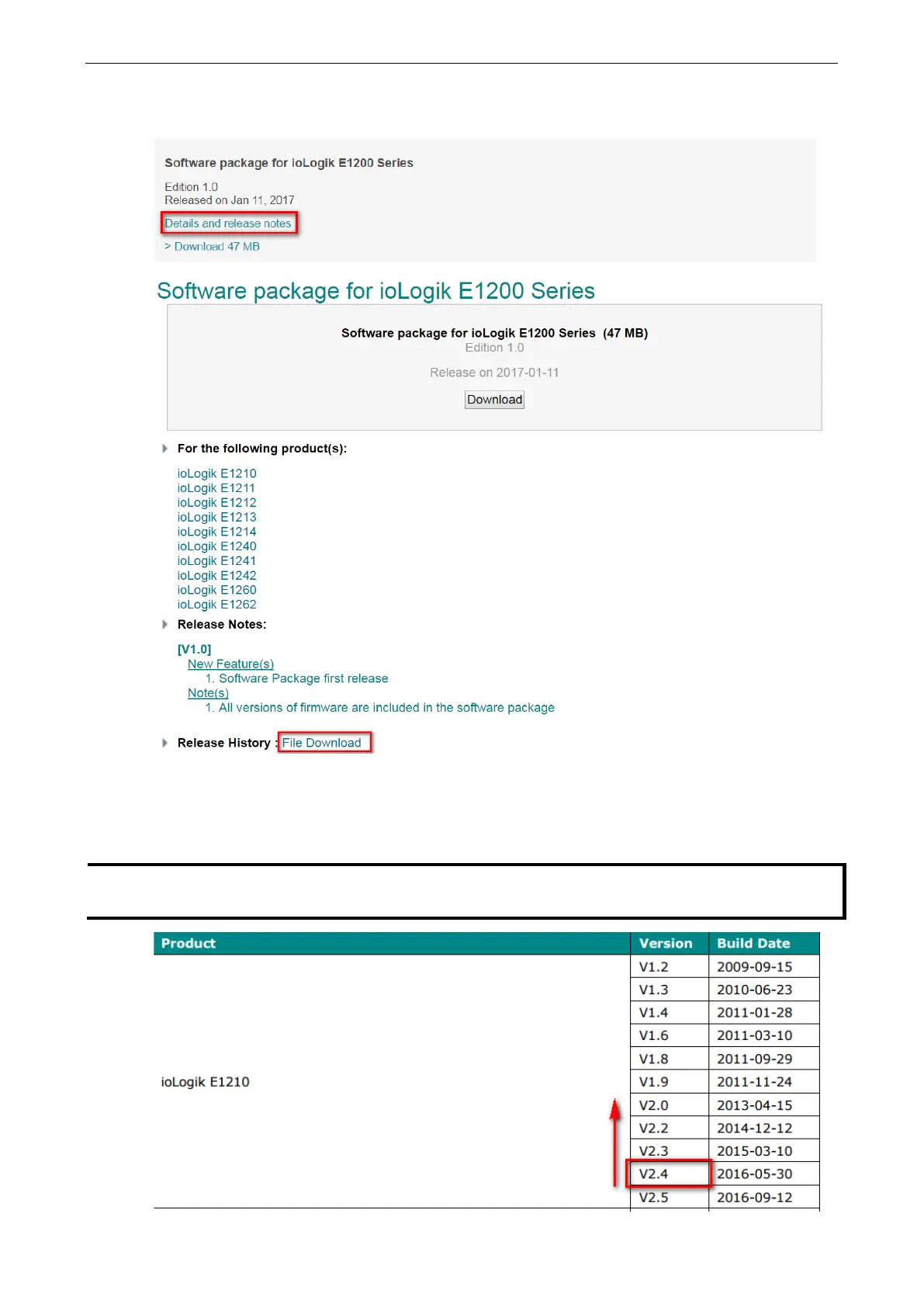 version release sequence one-by-one. For example, if you want to downgrade the ioLogik E1210’s firmware