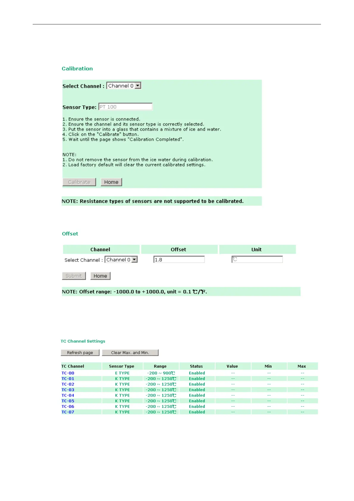 The ioLogik E1200 allows you to calibrate the temperature sensors. In each channel configuration section,