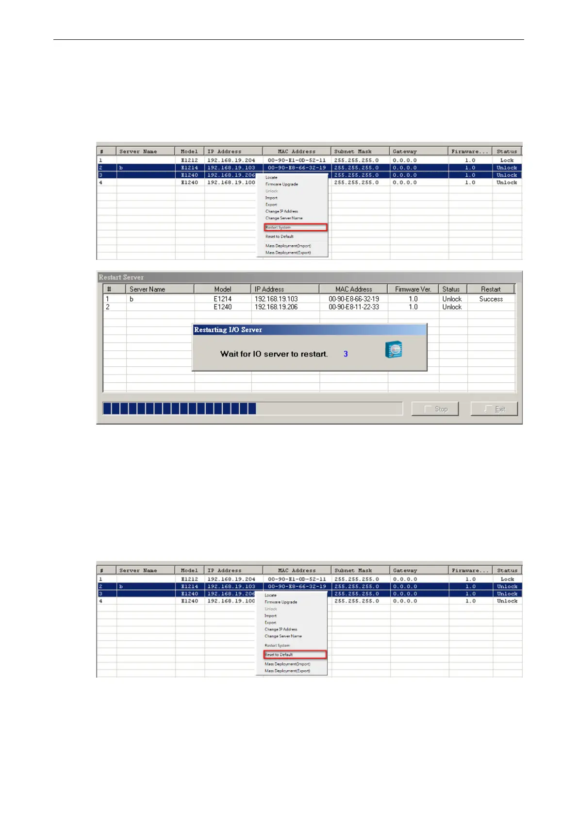 Restarting multiple ioLogik E1200 units is allowed. Select the ioLogik E1200 and right click to process this