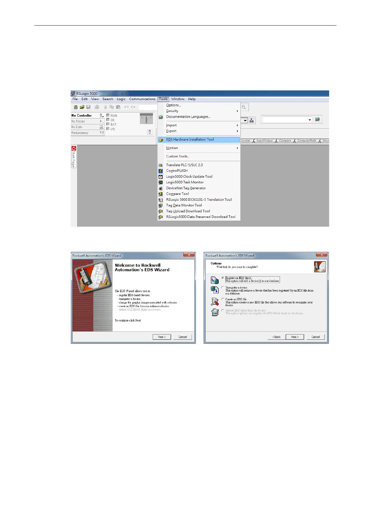 1. Start the RSLogix 5000 and open the EDS Hardware Installation Tool in Tools
