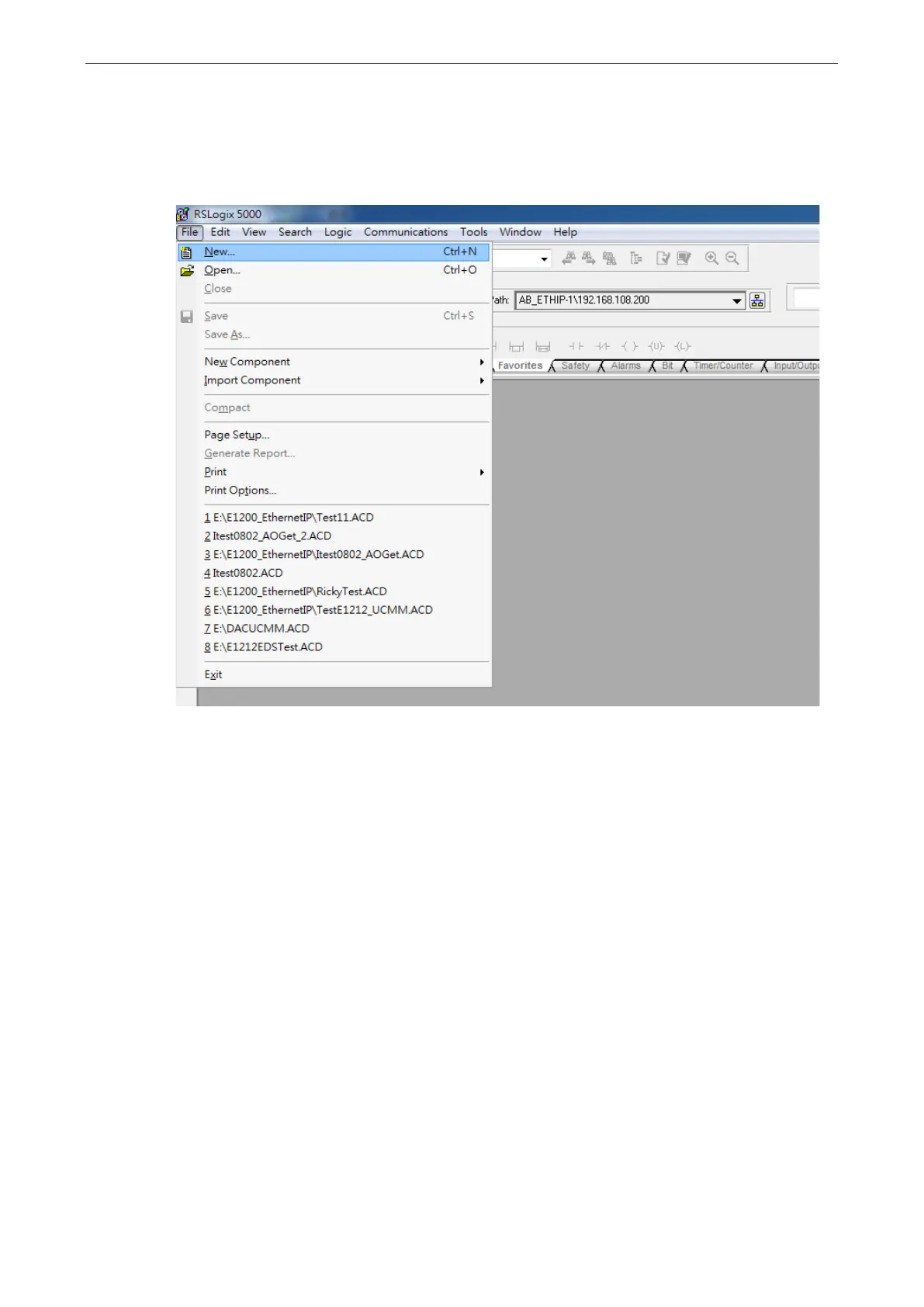 1. Open the RSLogix 5000 and then open a new project by pressing File