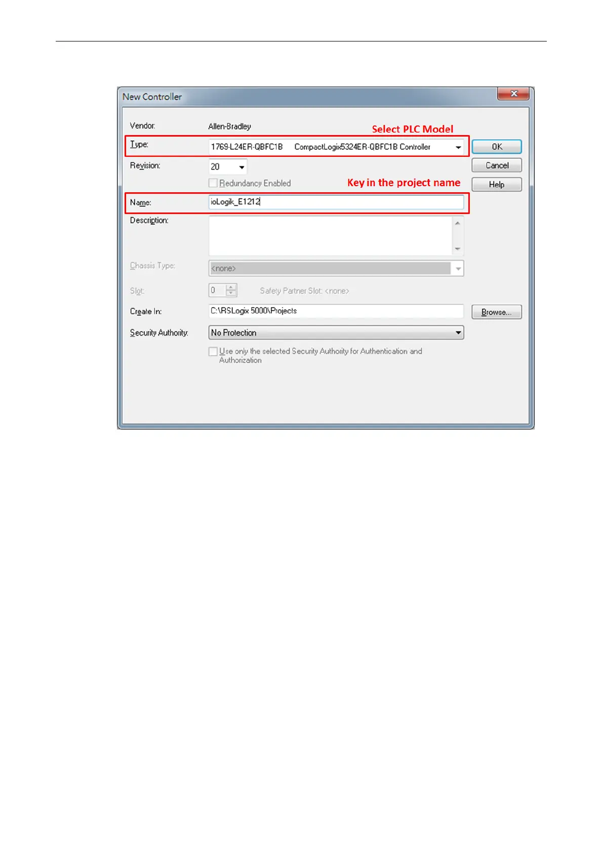 2. Select your PLC model under Type and key in the project name in the window. The