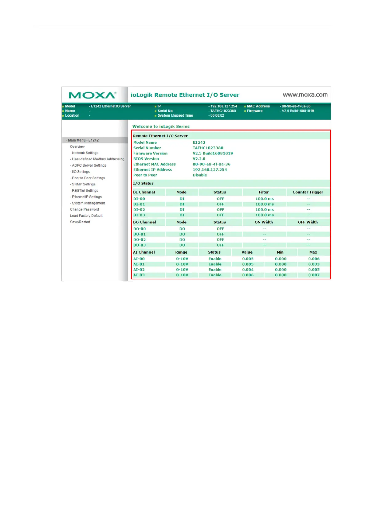 The Overview page contains basic information about the ioLogik E1200, including the model name, serial