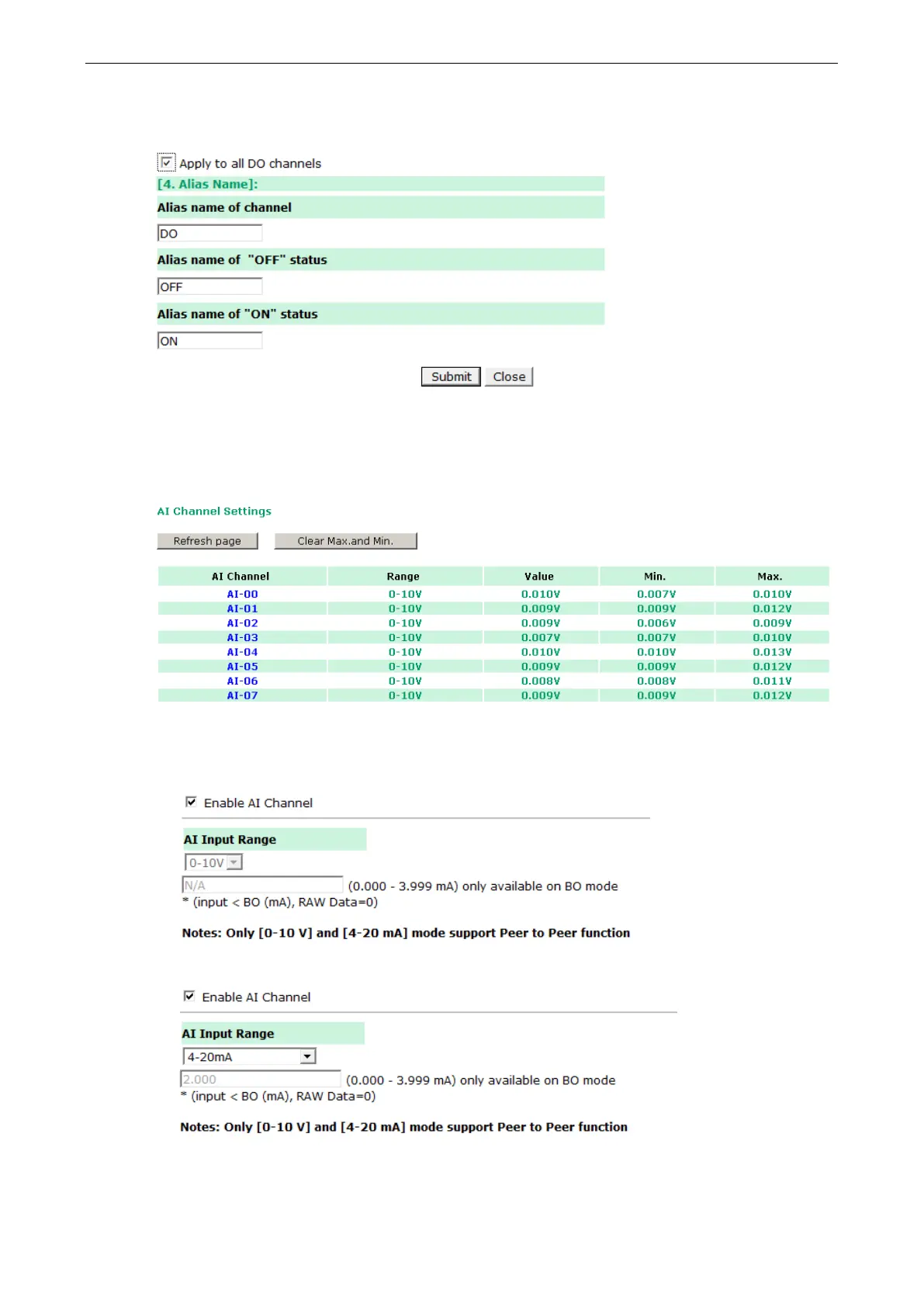 The current status of each AI (analog input) channel can be viewed on the AI Channel Settings page.
