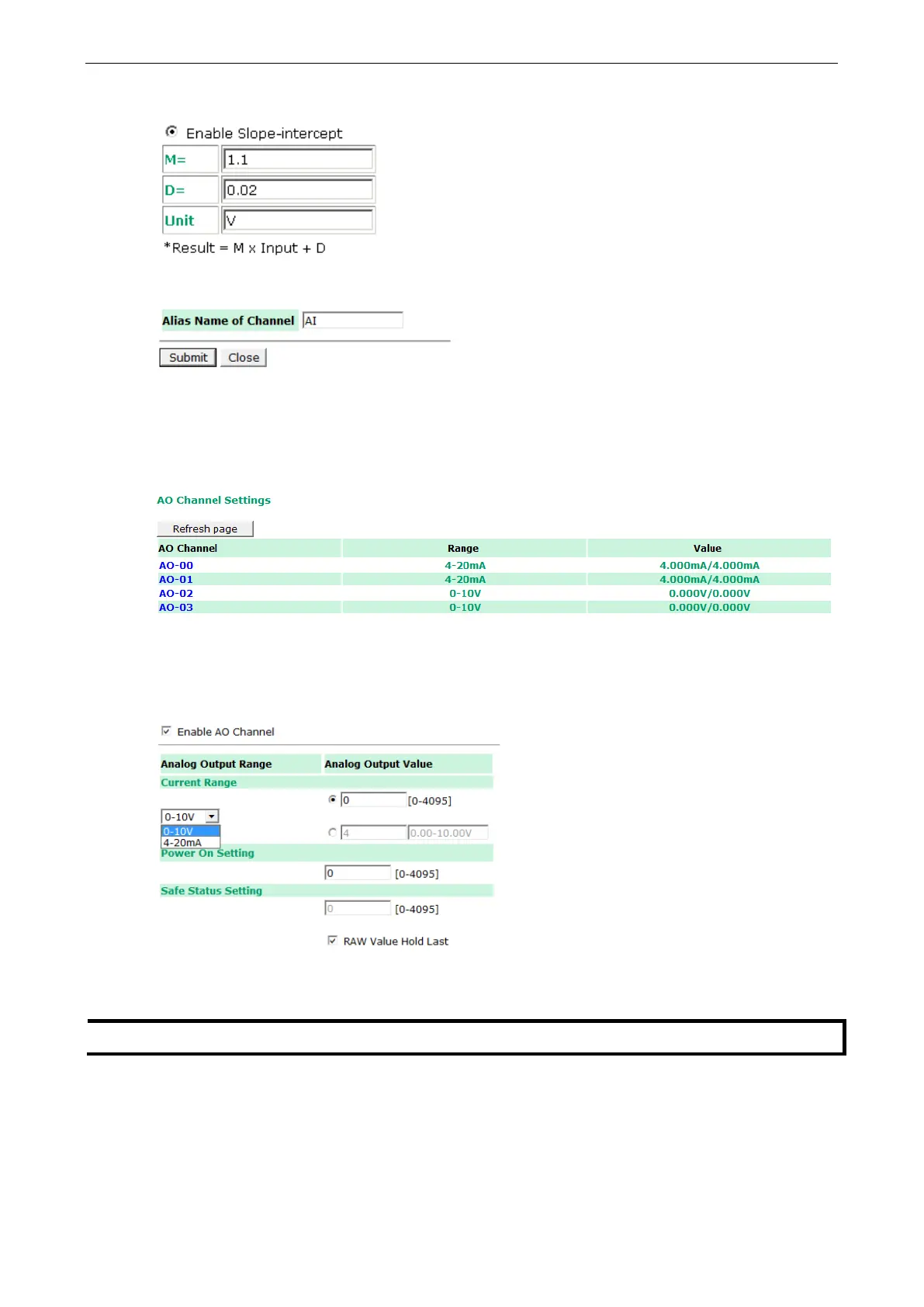 The current status of each AO (analog output) channel can be viewed on the AO Channel Settings page: