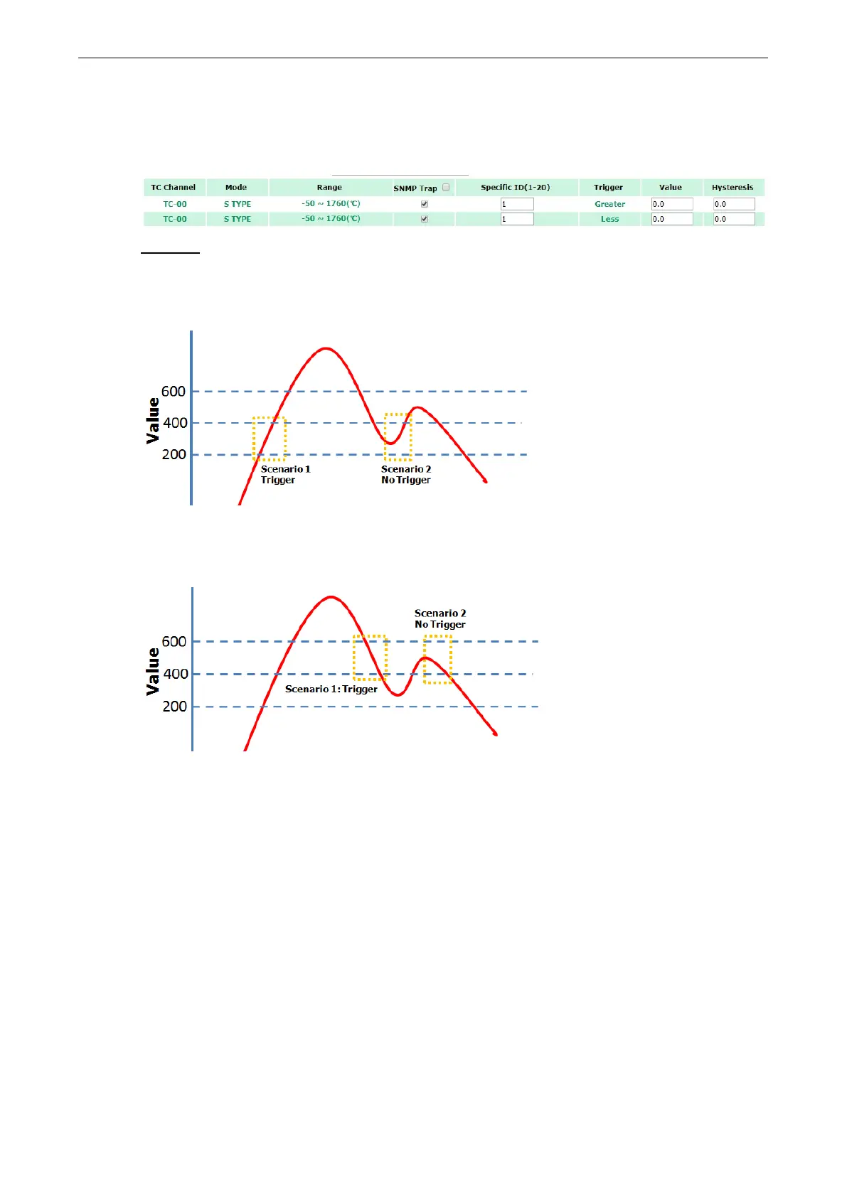 When Trigger = Greater, Value = 400, and Hysteresis = 200, the SNMP trap will only be triggered if the TC