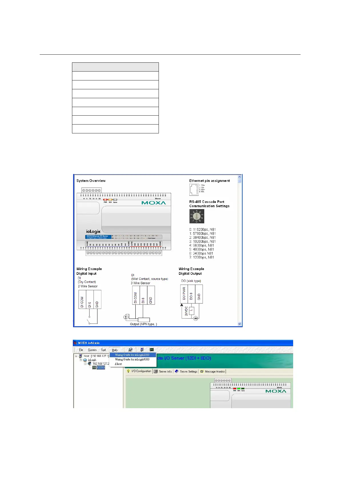 submenu to open a help file showing the wiring information and electrical characteristics of the ioLogik