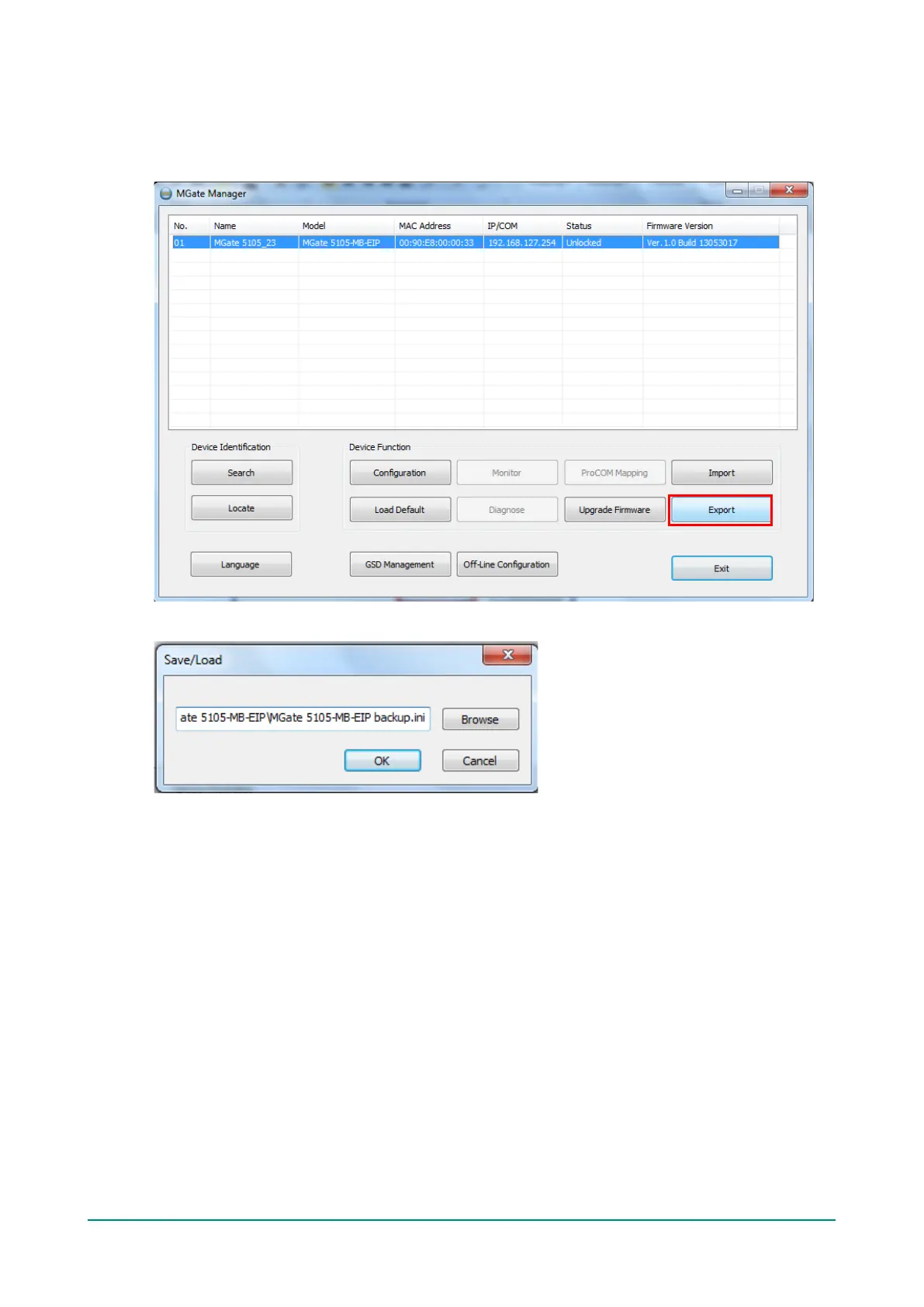 The export function saves all the configuration settings and parameters of the MGate 5105-MB-EIP in a *.ini