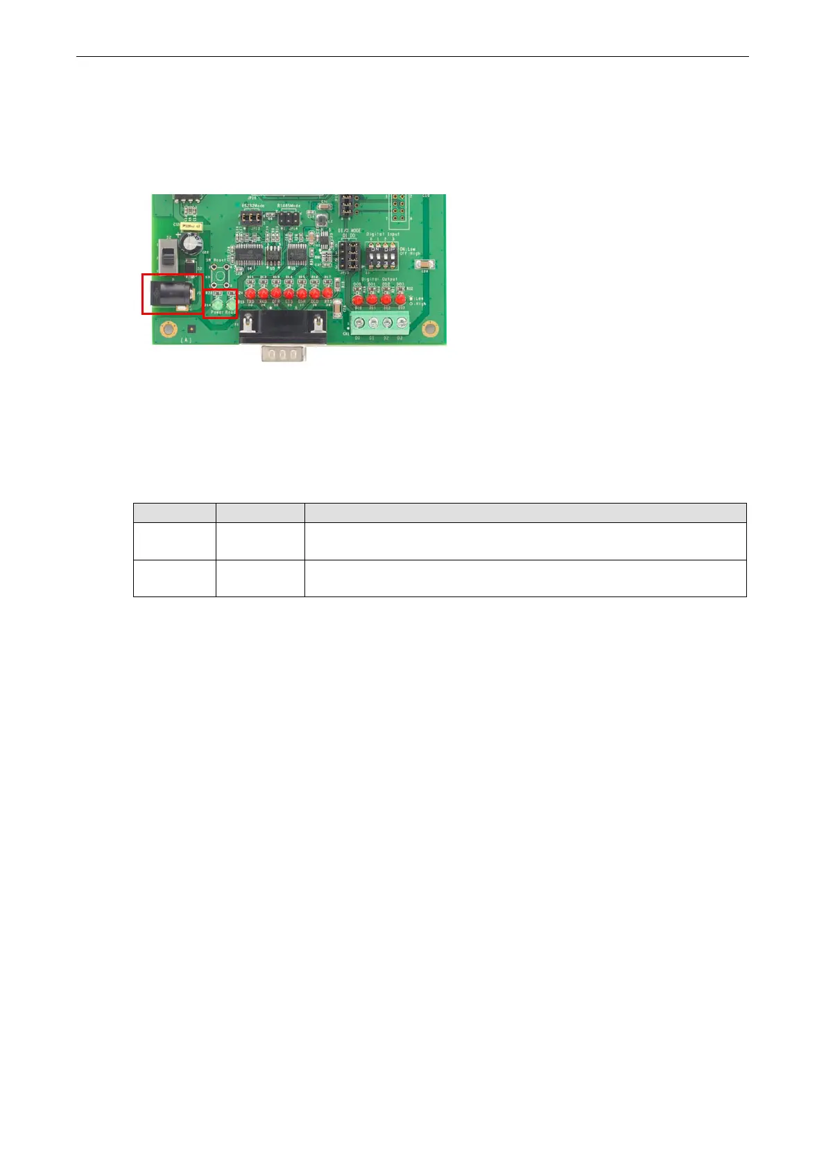 Connect the 12-48 VDC power line with the evaluation board’s power jack. If the power is properly supplied, the