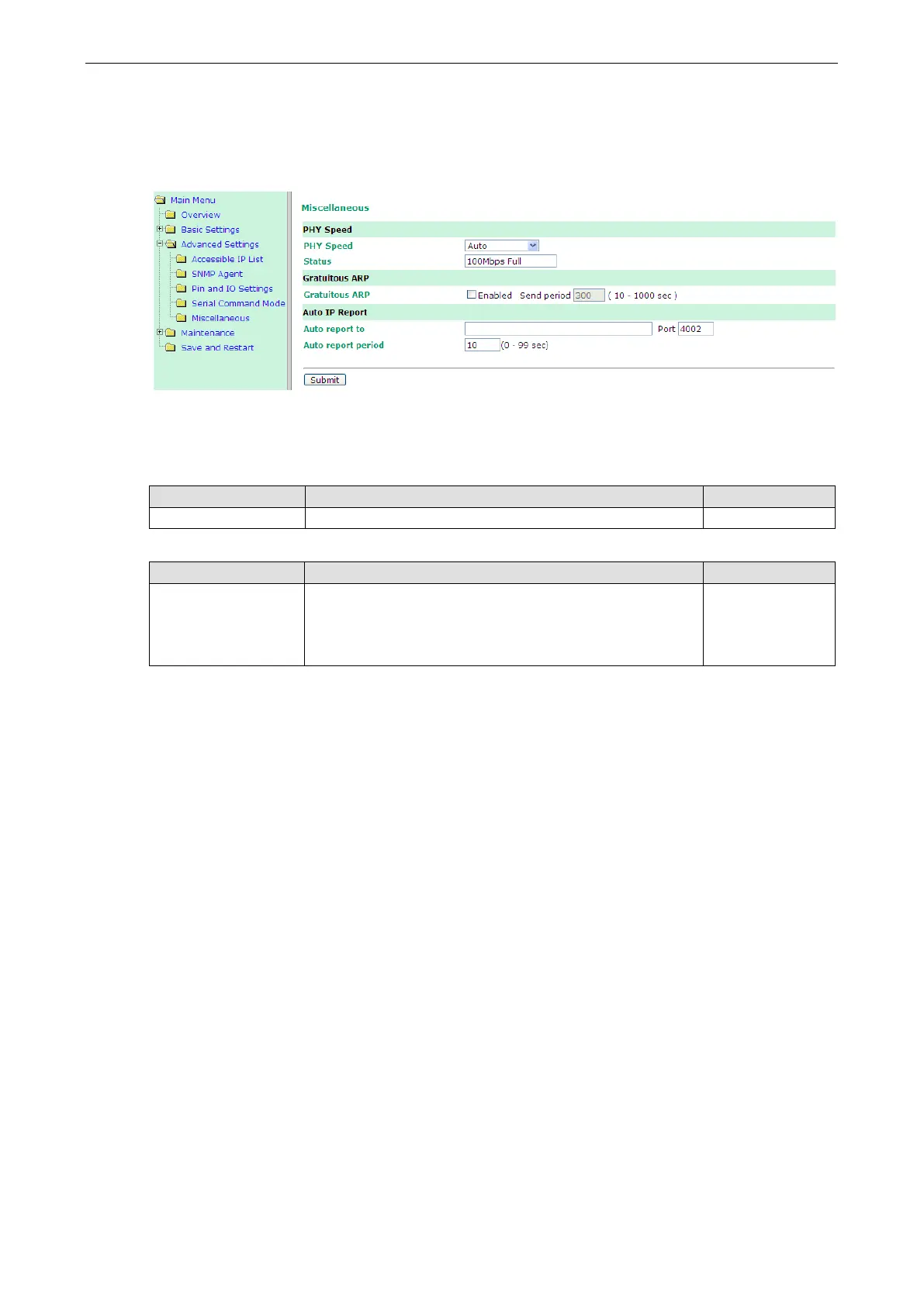 PHY Speed, Gratuitous ARP, and Auto IP Report are configured in the Miscellaneous section under