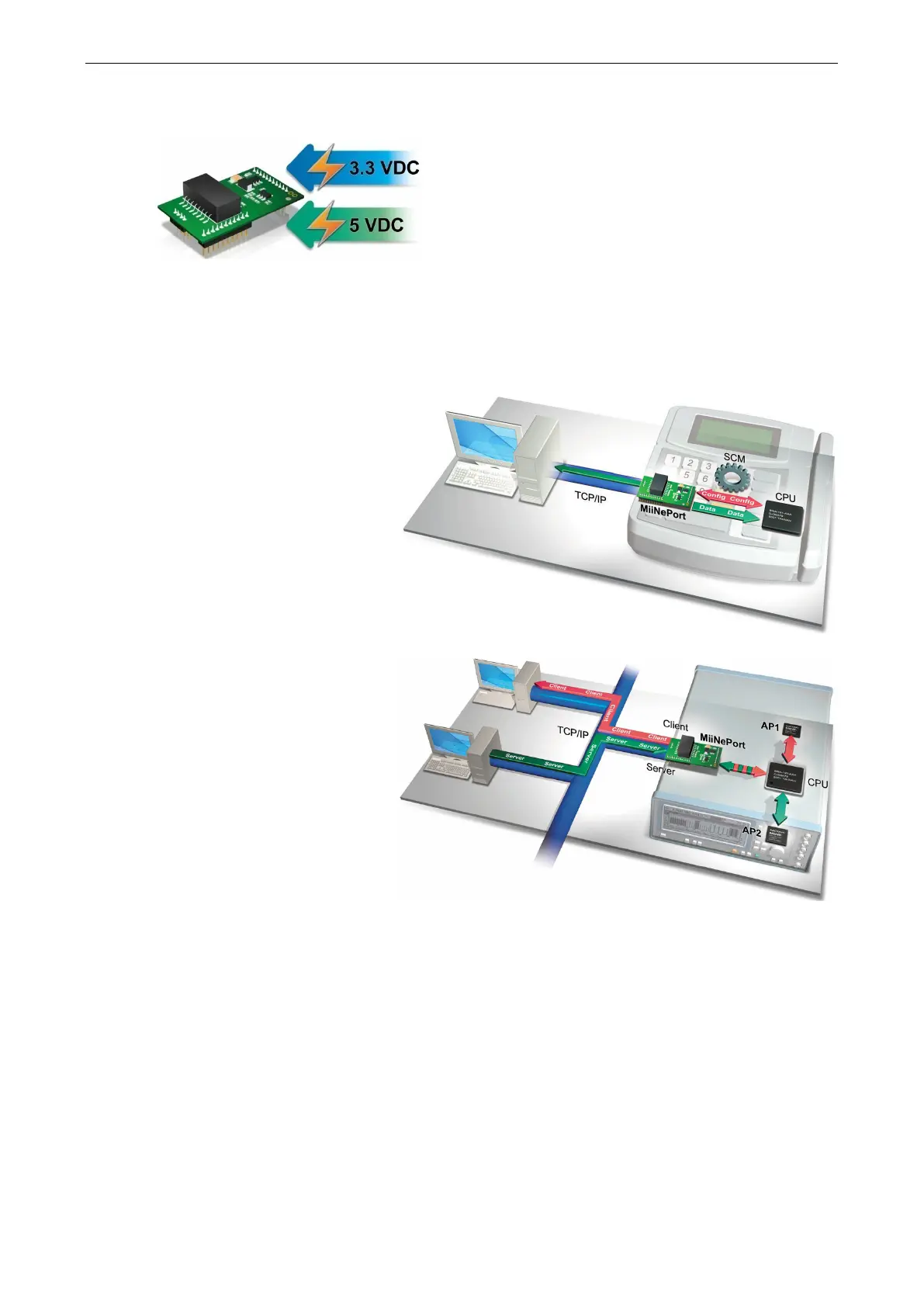 MiiNePort’s system power input to either 3.3 VDC or 5 VDC.