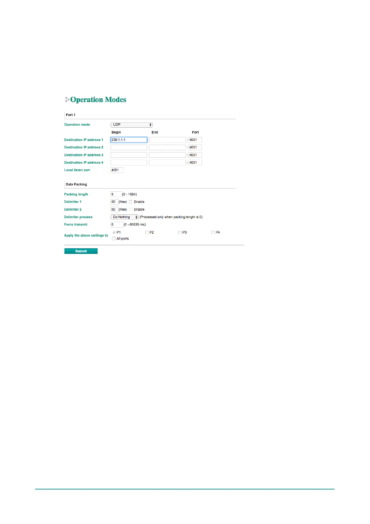 Type the IP address (e.g., 239.1.1.1) assigned to the multicast group in the Begin column. The NPort will