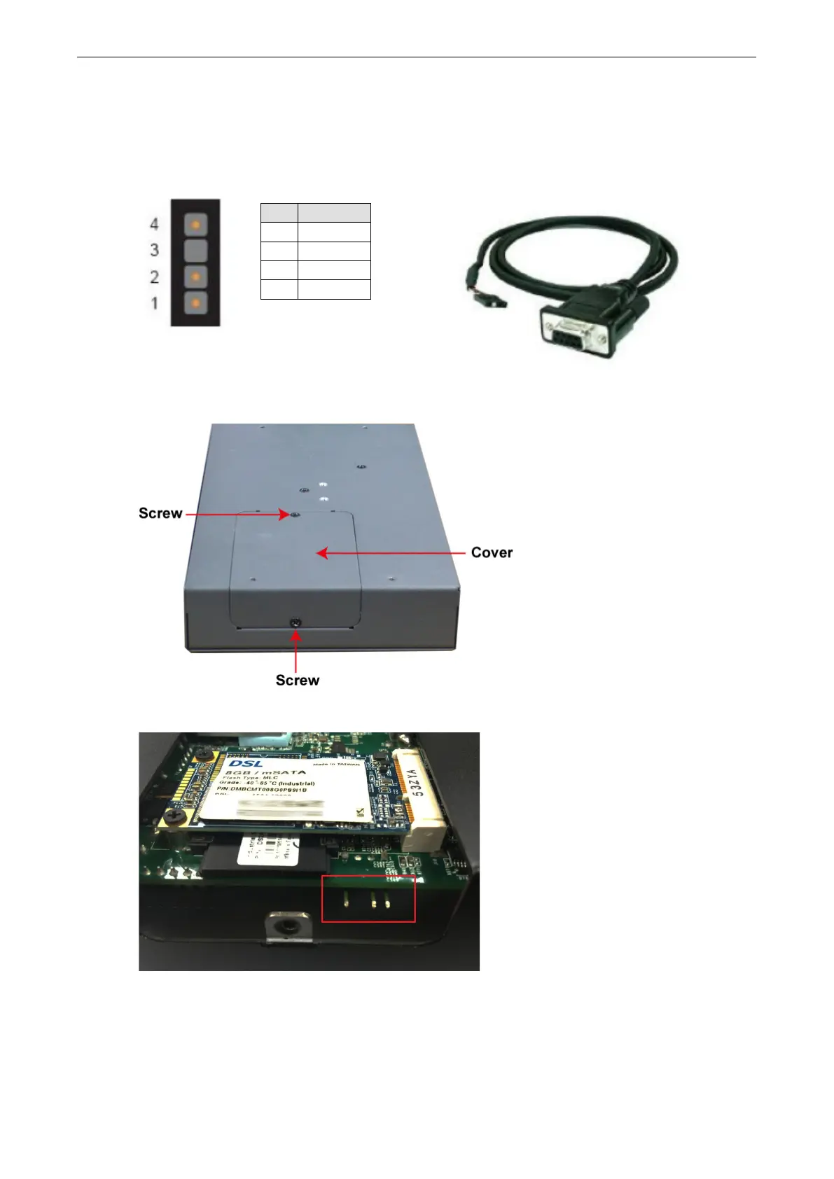 The UC-8410A’s console port is a 4-pin pin header RS-232 port. Refer to the following figure for the pin