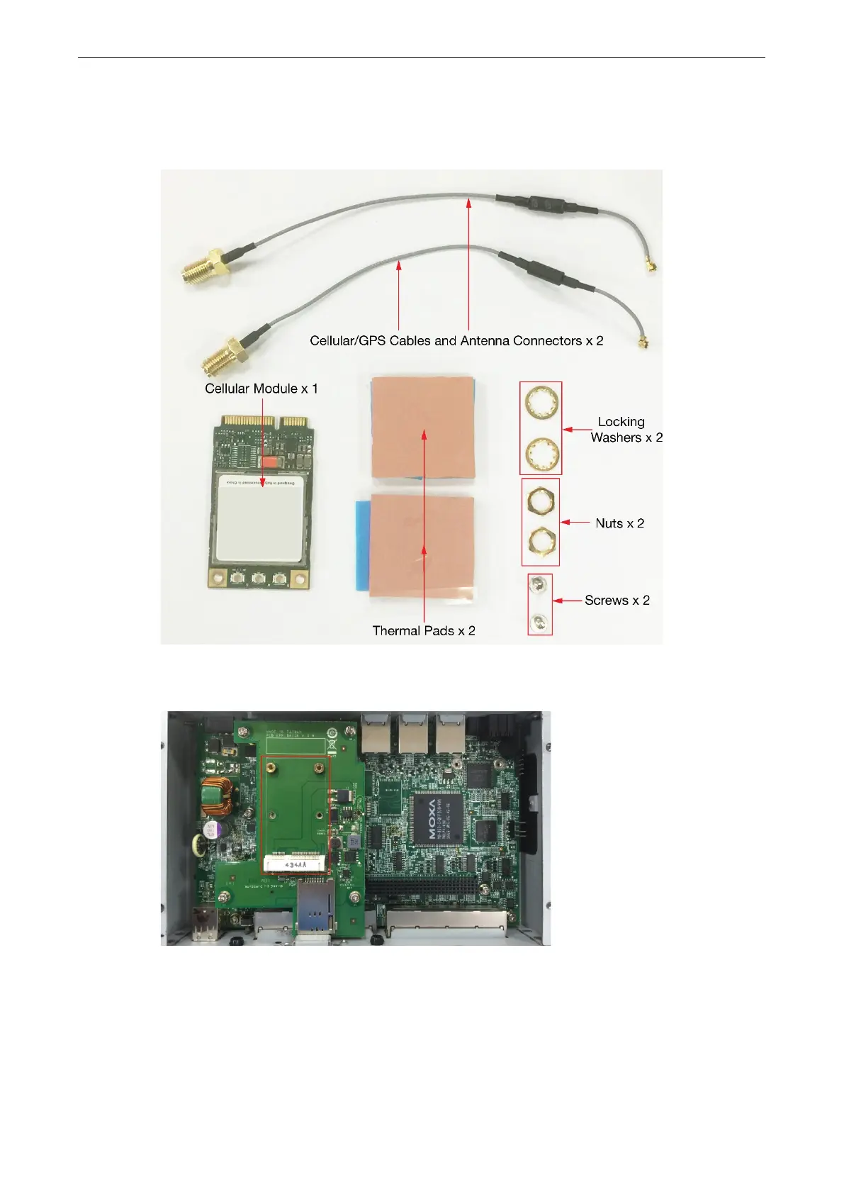The package includes 1 cellular module, 2 cellular/GPS antenna cables and connectors, 2 thermal pads, 2