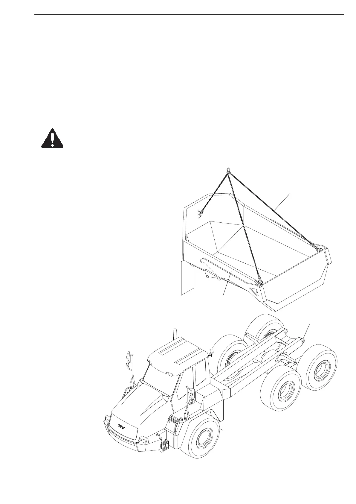 Attach the lifting device in all three dumper body lifting points, and lift to release the weight on the tilt bearings.