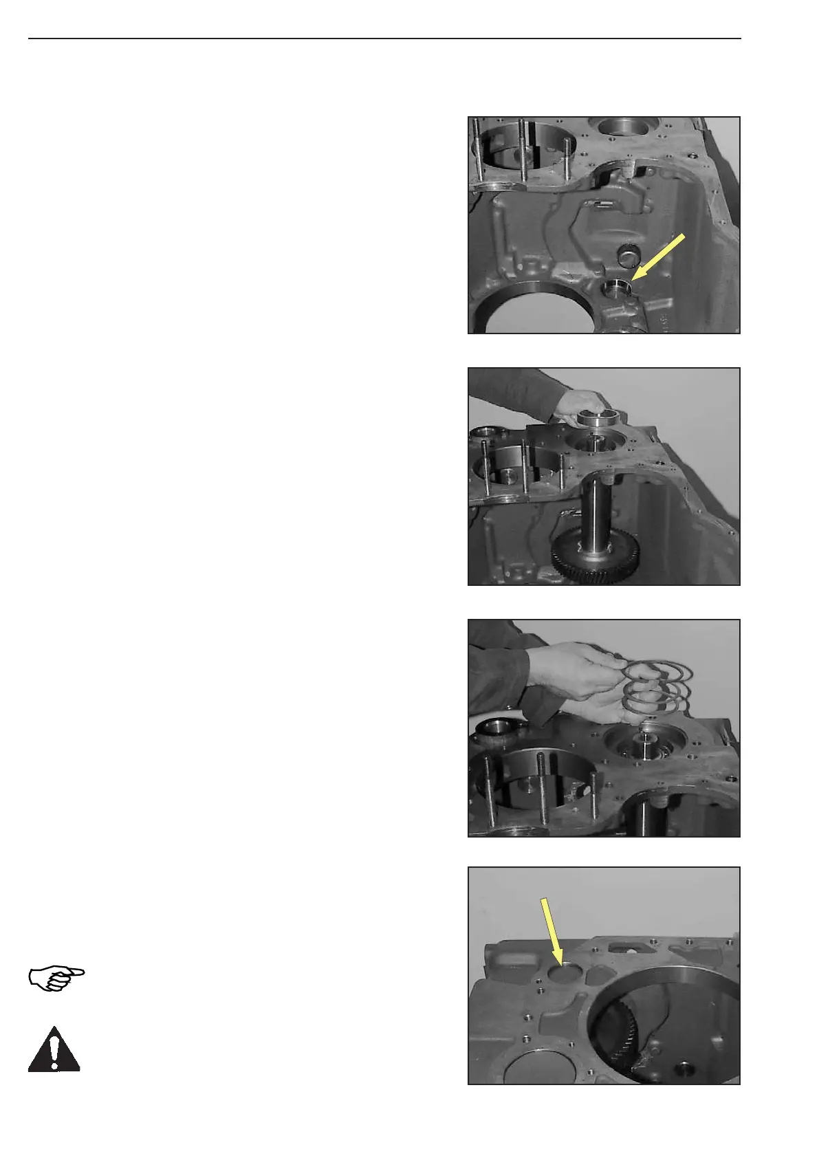 Insert bearing outer race (arrow) into housing bore until contact is