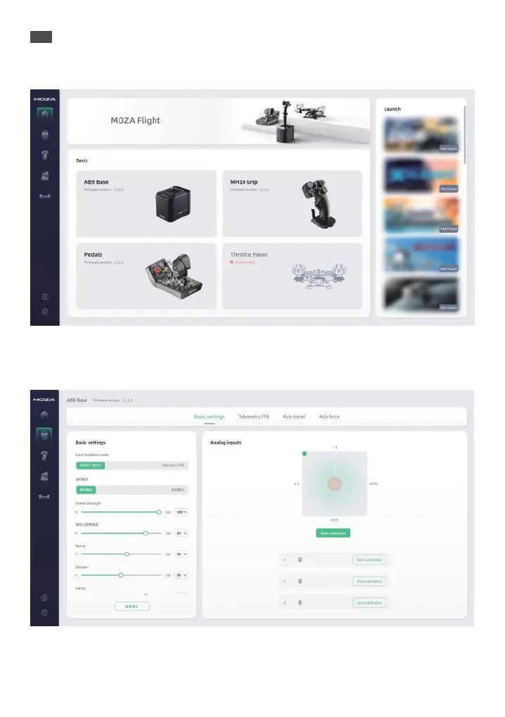 The main page displays the status of connected devices, including the base, flight stick, throttle,