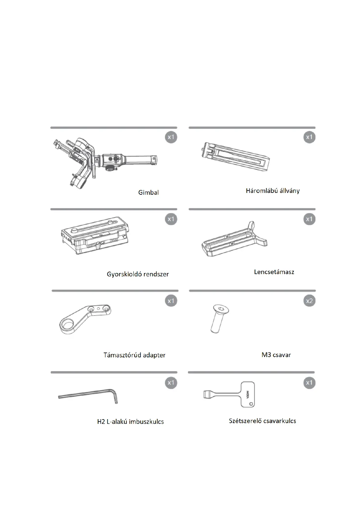 bármelyik elem hiányzik, kérjük, lépjen kapcsolatba a MOZA-val vagy a helyi