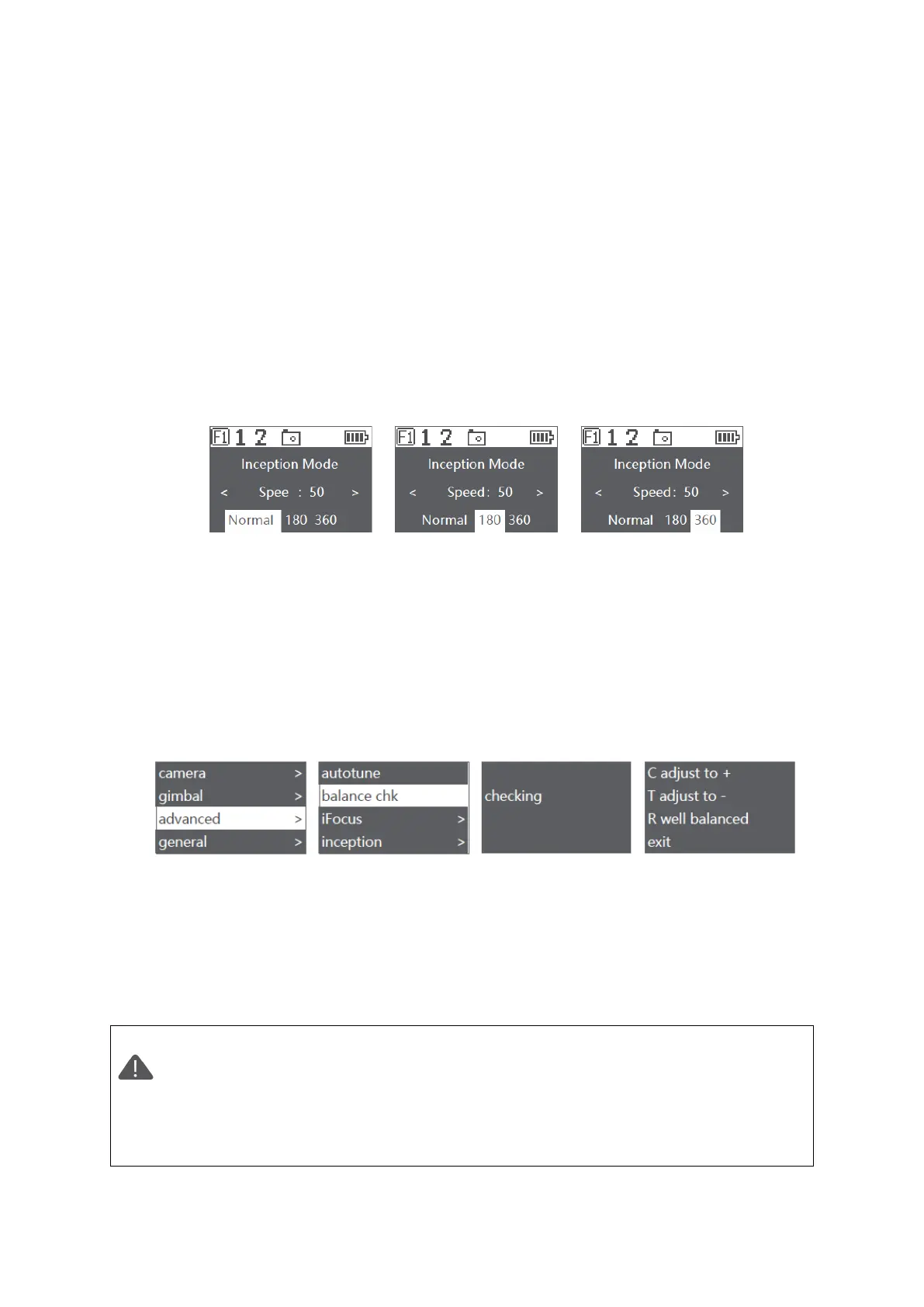 • Enter the menu, select advanced>balance chk, the gimbal begins to check the