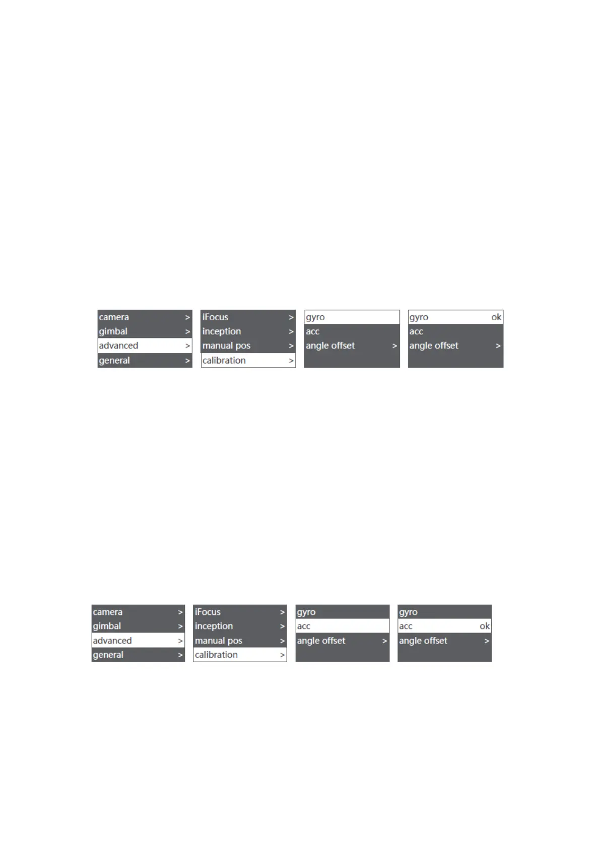 • Vejděte do menu, zvolte advanced/pokročilé>calibrate/kalibrace>Gyro cali a