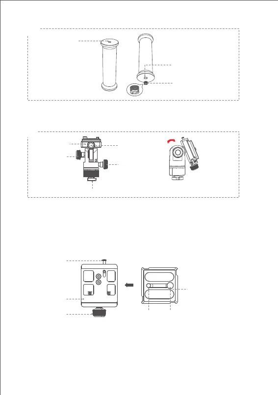 ● 旋松俯仰调节螺丝,按压俯仰调节螺丝,如图旋转快装支架,调节云台俯仰角