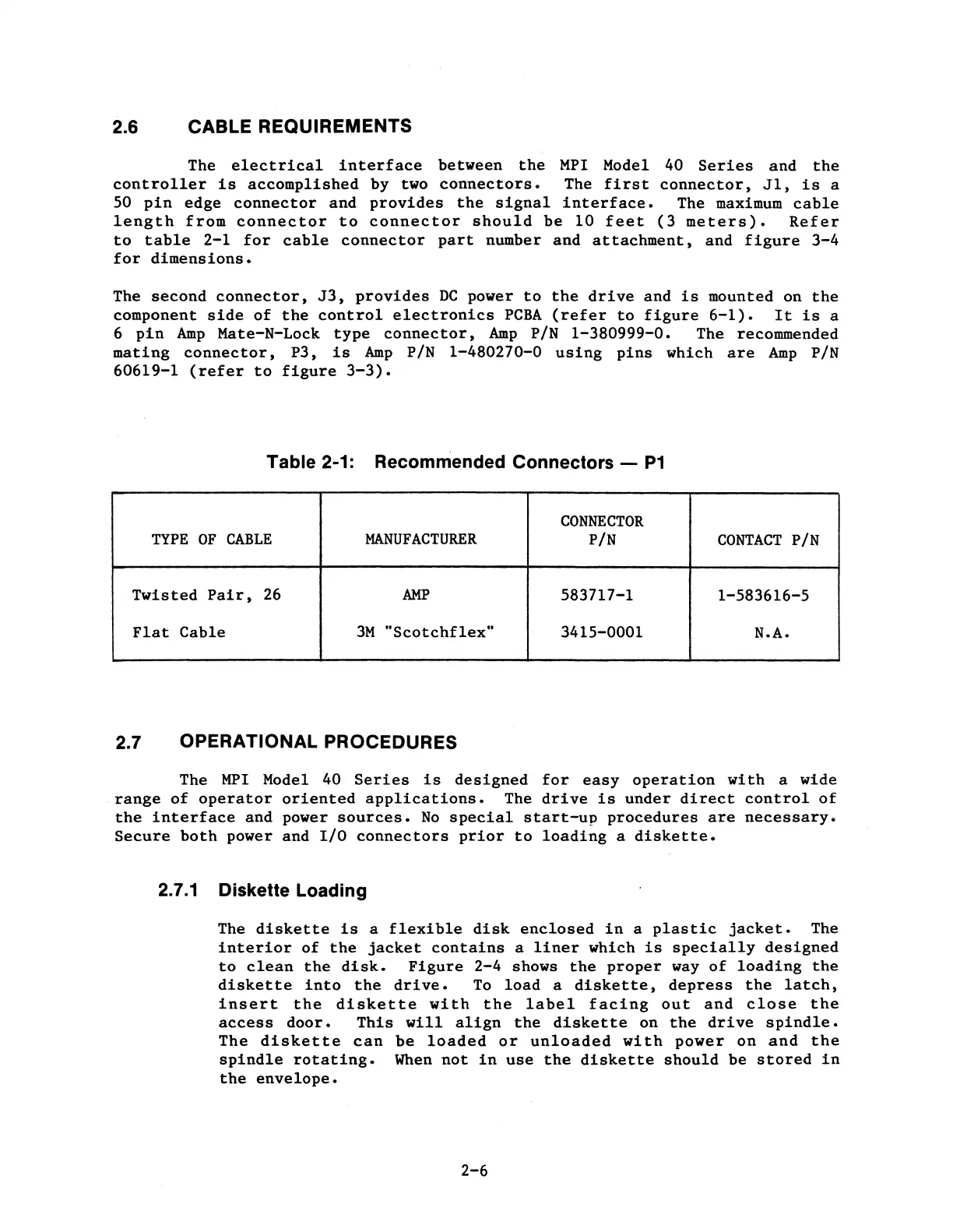 MPI 40 Series - Cable Requirements; Type of Cable; Operational Procedures; Diskette Loading