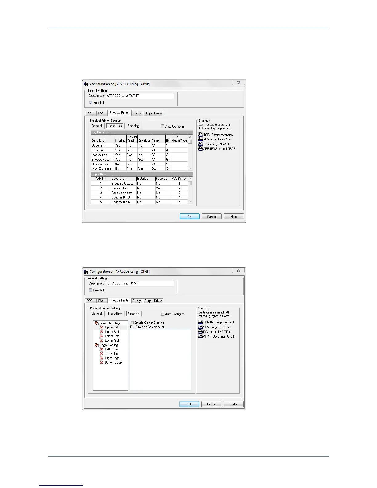 Trays/Bins describe and configure the input trays and output bins of the target