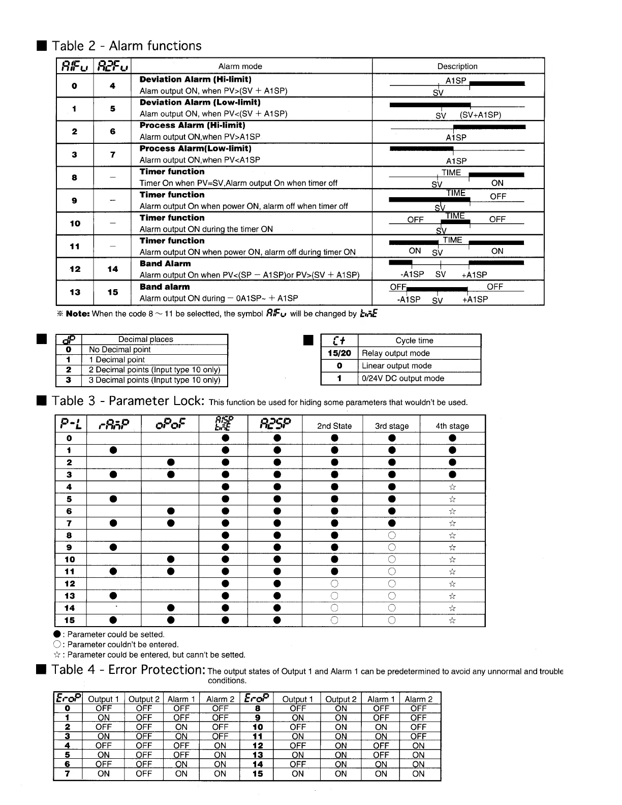MPI VT10 Series - Configuration Details; Alarm Functions and Modes; Error Protection Settings