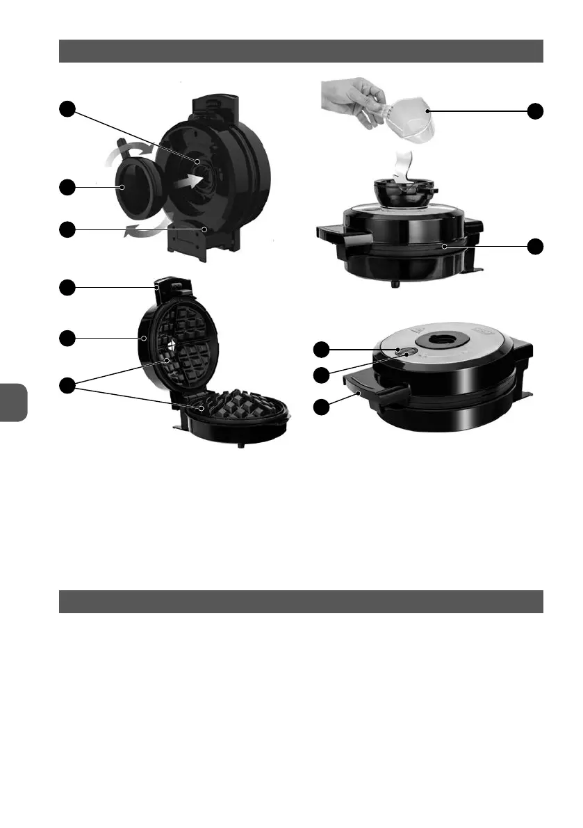 3. Reinigen Sie die Heizplatten des Waffeleisens (6), den Trichter (2), den Messlöffel (3) gemäß