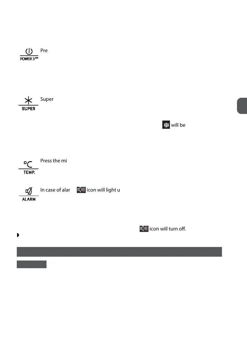 IMPORTANT! When the power function is on, the refrigerator stops cooling. Do not store any food in the fridge
